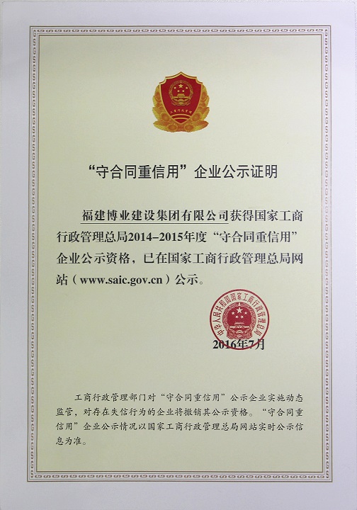 2014-2015年度守合同重信用企業(yè)公示證明